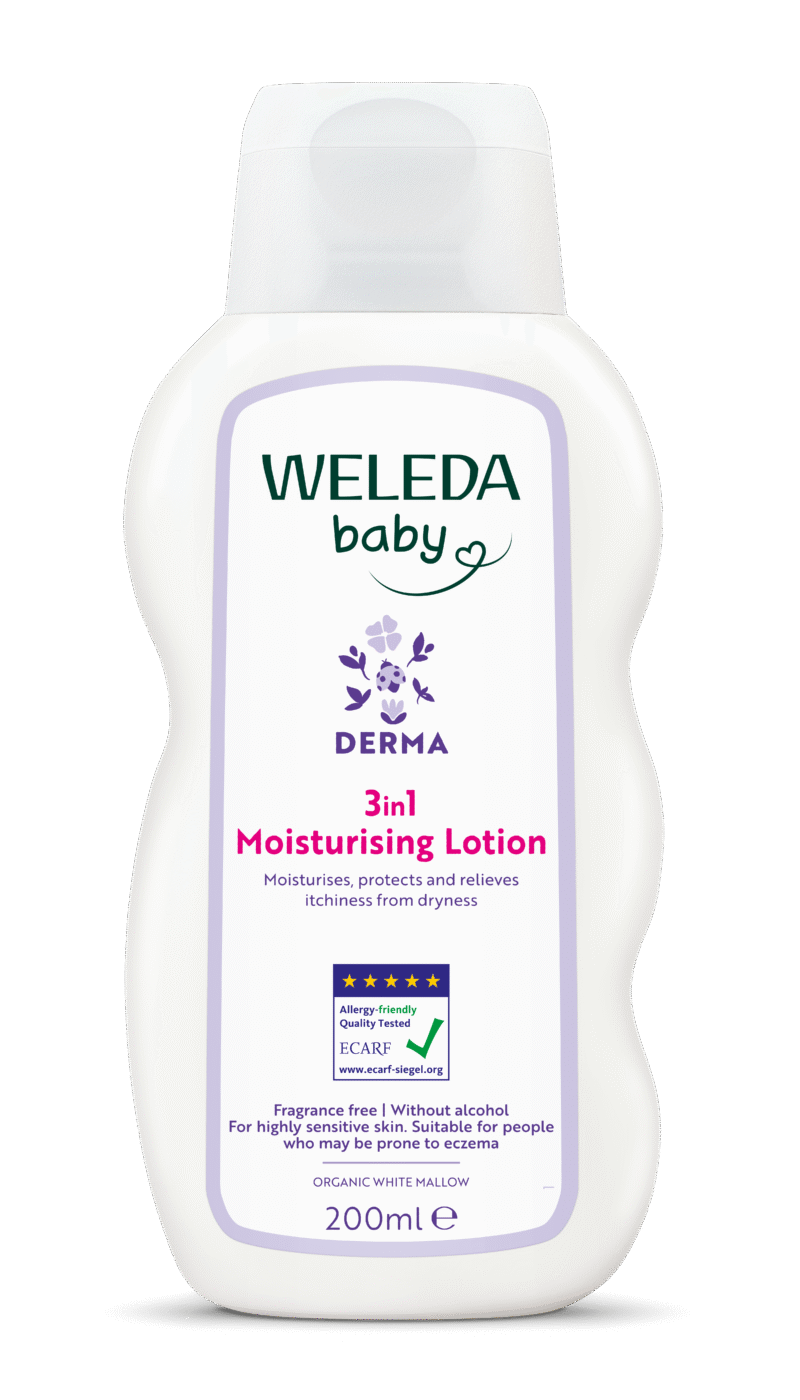 Hellita oma beebi tundlikku või atoopilist nahka Weleda Baby Med 3in1 Weisse Malve hoolduspiimaga, mis pakub õrna ja rahustavat niisutust.